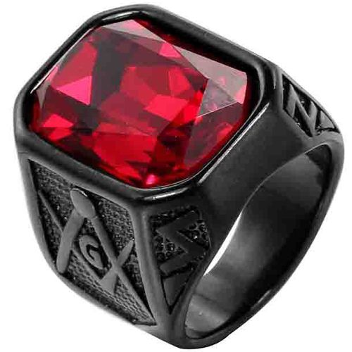 COI Black Titanium Masonic Freemason Ring With Created Red Ruby/Black Onyx/Blue Sapphire/Green Emerald. Comfort fit with inside round shank. A 100% tailor-made ring for you. Classic with delicated details, unsurpassed quality plus incredible value! Perfect as a wedding band, engagement ring or just for everyday wear due to its extreme comfort!